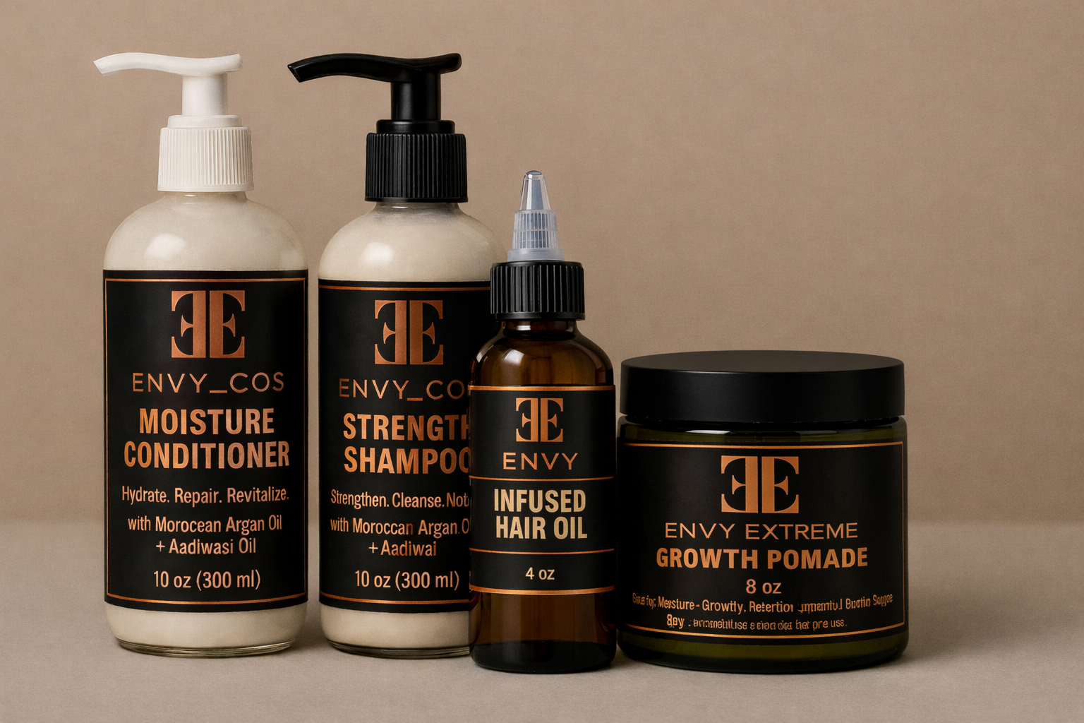 Ready to grow stronger, fuller hair — without the fluff? This 5-piece hair growth kit is made for textured hair, thinning edges, and alopecia support. Includes shampoo, conditioner, growth butter, herbal oil, and pomade.”
